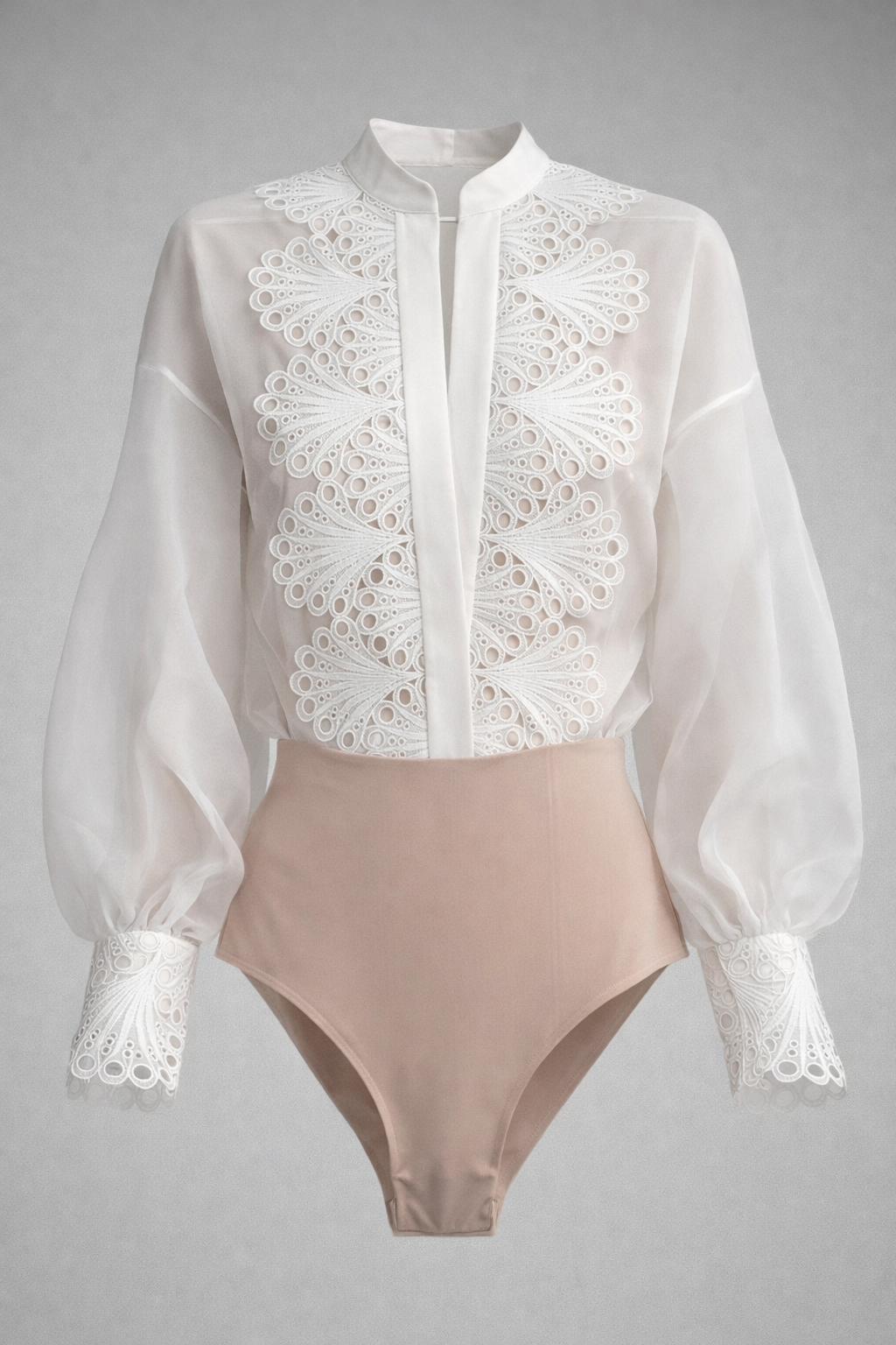 The Vela Bodysuit is an elegant statement piece crafted in lightweight sheer organza, featuring intricate lace appliqué detailing at the front. Designed with a structured mandarin collar and voluminous bishop sleeves finished with delicate lace cuffs, it balances softness and structure effortlessly. The seamless back remains clean and uninterrupted, highlighting the purity of the silhouette, while the nude stretch bodysuit base offers comfort, support, and a smooth fit.